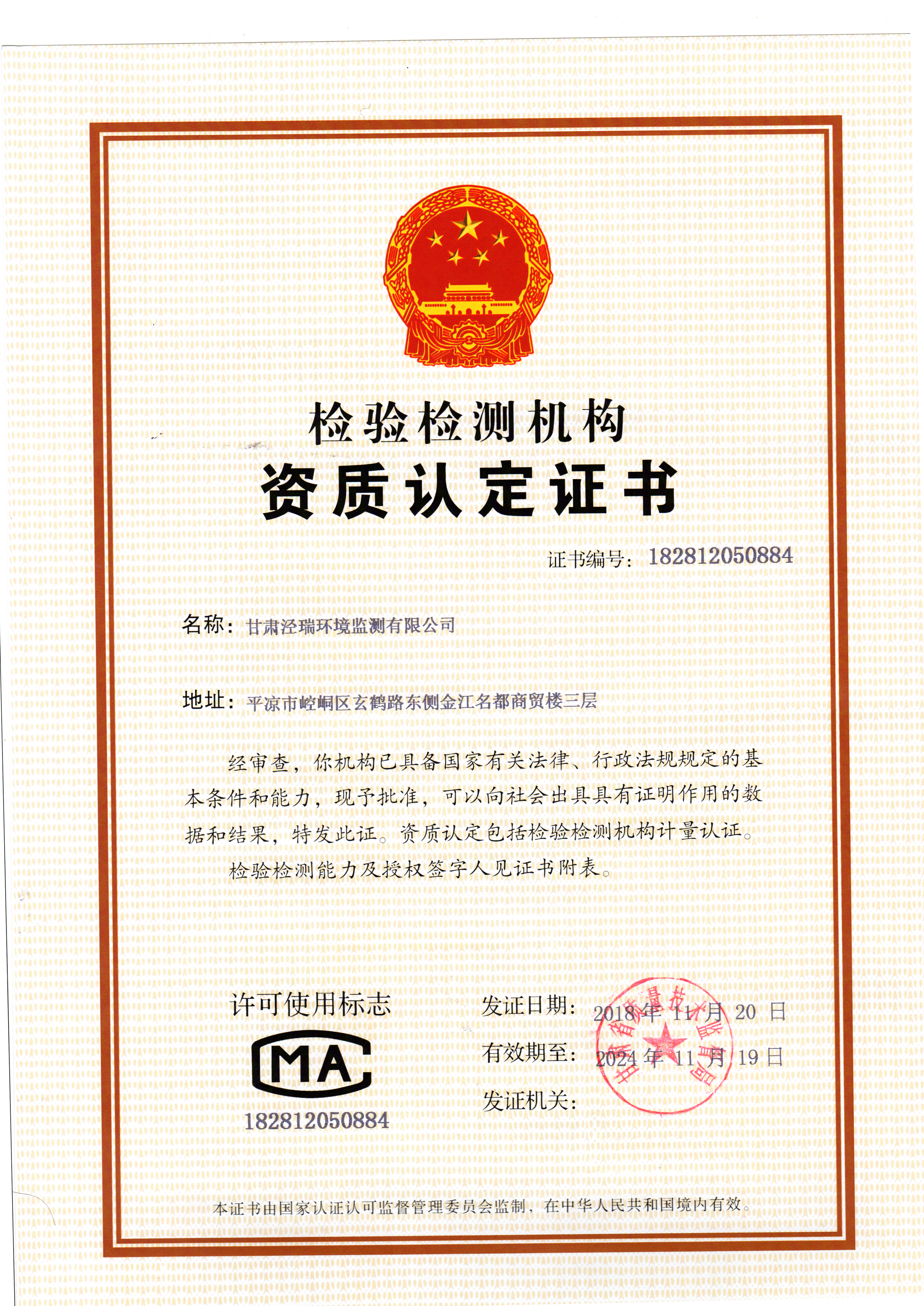 甘肅涇瑞環(huán)境監(jiān)測(cè)有限公司 電話(huà):0933-8693665 地址:甘肅省平?jīng)鍪嗅轻紖^(qū)涇水嘉苑7號(hào)樓301號(hào)營(yíng)業(yè)房