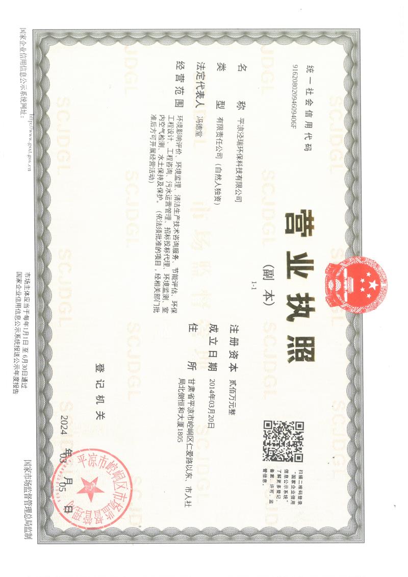 平?jīng)鰶苋瓠h(huán)保科技有限公司營業(yè)執(zhí)照