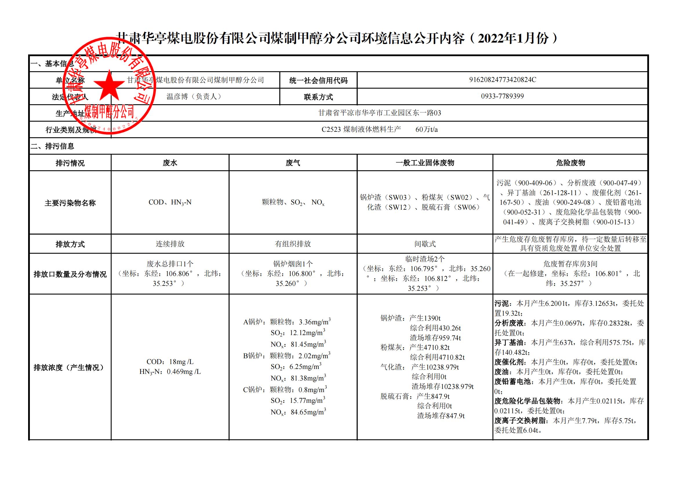 煤制甲醇分公司環(huán)境信息公開內(nèi)容(2022年1月)