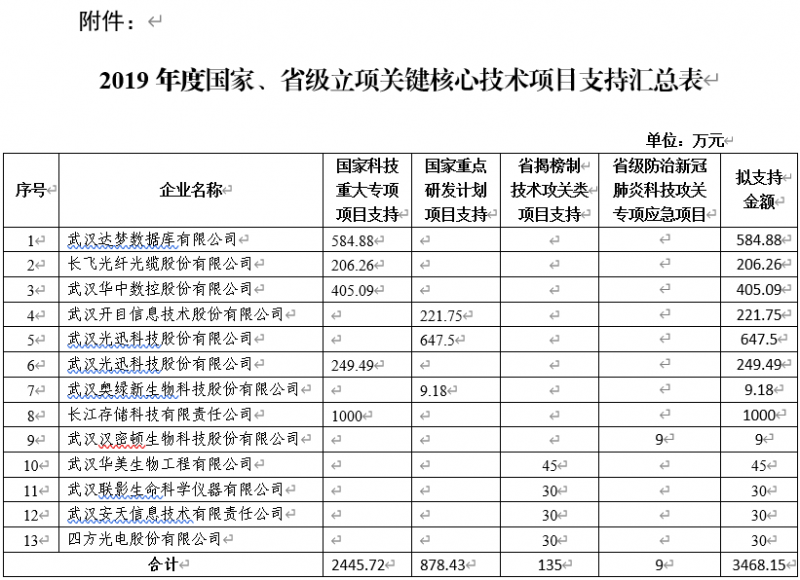 武漢東湖新技術(shù)開發(fā)區(qū)關(guān)于2019年度國家、省級(jí)立項(xiàng)關(guān)鍵核心技術(shù)項(xiàng)目支持結(jié)果的公示